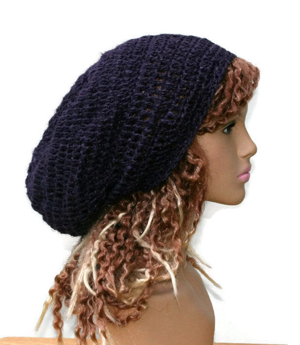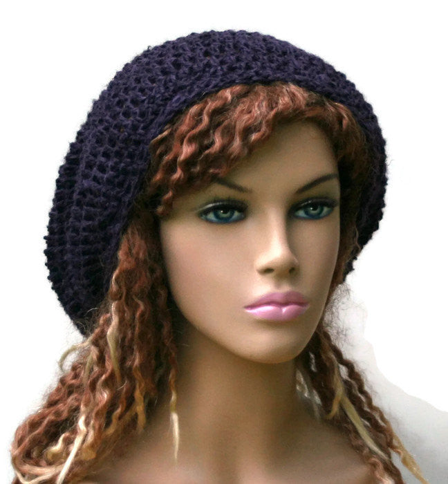 Hemp Wool Dark purple slouchy beanie dreadlock hippie tam hat