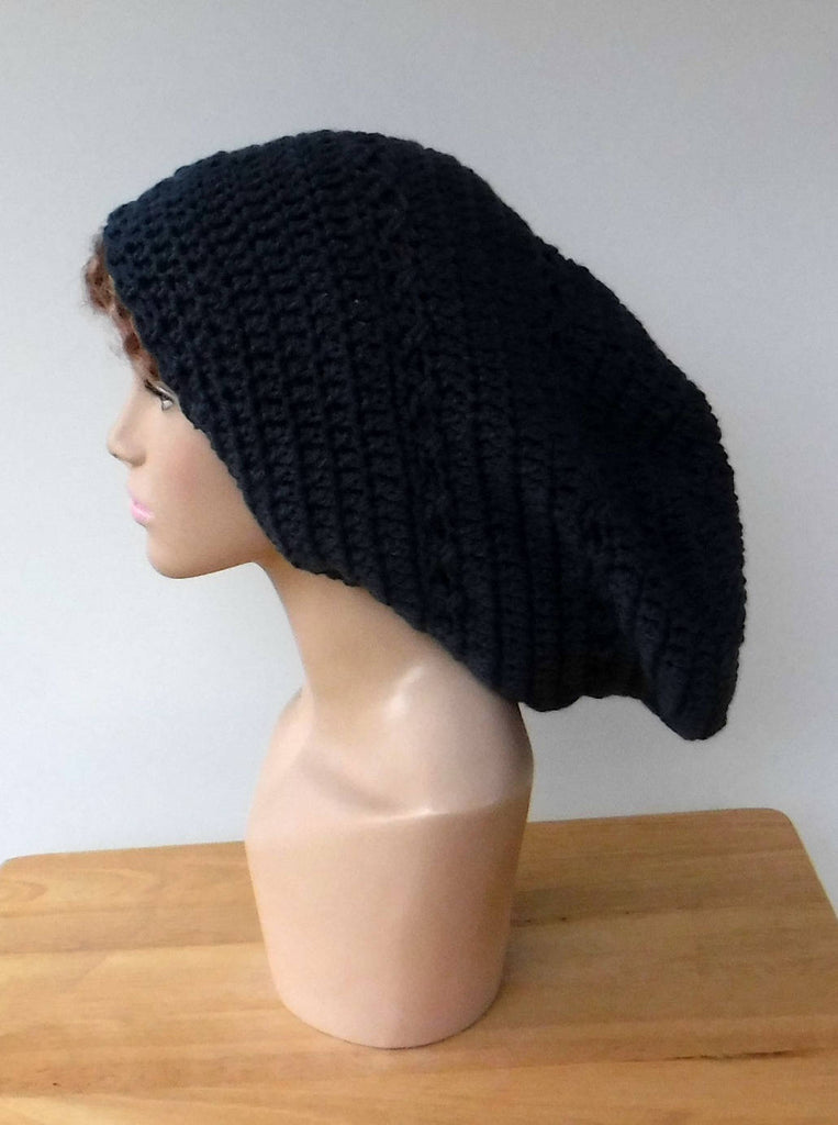 This hippie tam in dark denim blue is a large version of my slouchy beanies and will provide ample room in the back for dreads, long locks or just for that super slouchy look.