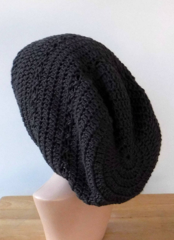 This hippie tam in graphite (a dark brownish grey) is a large version of my slouchy beanies and will provide ample room in the back for dreads, long locks or just for that super slouchy look.